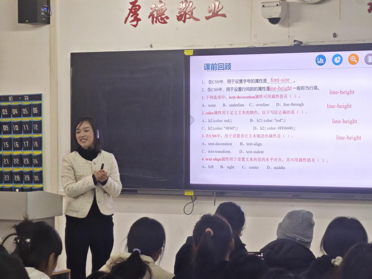 课堂上,刘芳老师以案例化教学为核心,结合贴近生活的实例展开知识点讲解,将抽象的网页设计原理与实际应用场景紧密结合,有效降低了学习难度,激发了学生的学习兴趣。授课过程中,她注重与学生的互动交流,多次走下讲台,与学生面对面沟通,及时回应学生疑问,充分调动了课堂氛围,拉近了与学生之间的距离,展现出扎实的教学功底和良好的课堂把控能力。在场听课教师纷纷表示,刘老师的课堂设计新颖、互动性强,案例选择贴近生活,为大家提供了可借鉴的教学范例,对今后优化自身教学具有重要启发意义。
