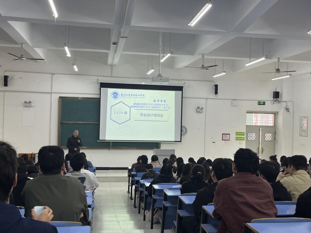 讲座伊始,数据科学与大数据技术教研室主任冯学晓率先发言。她着重强调毕业设计(论文)在本科人才培养中的核心地位,指出其是检验学生专业知识整合能力、解决实际问题能力及创新意识的关键环节。同时,冯学晓主任结合学校最新发布的《本科毕业设计(论文)管理规范》等文件,逐条款解读了学校对毕设选题、过程管理、成果审核的具体要求,明确了“杜绝学术不端”“严控时间节点”“保证成果实用性” 三大核心原则,并鼓励同学们珍惜此次学习机会,主动对接文件要求,为毕设工作打下扎实基础。