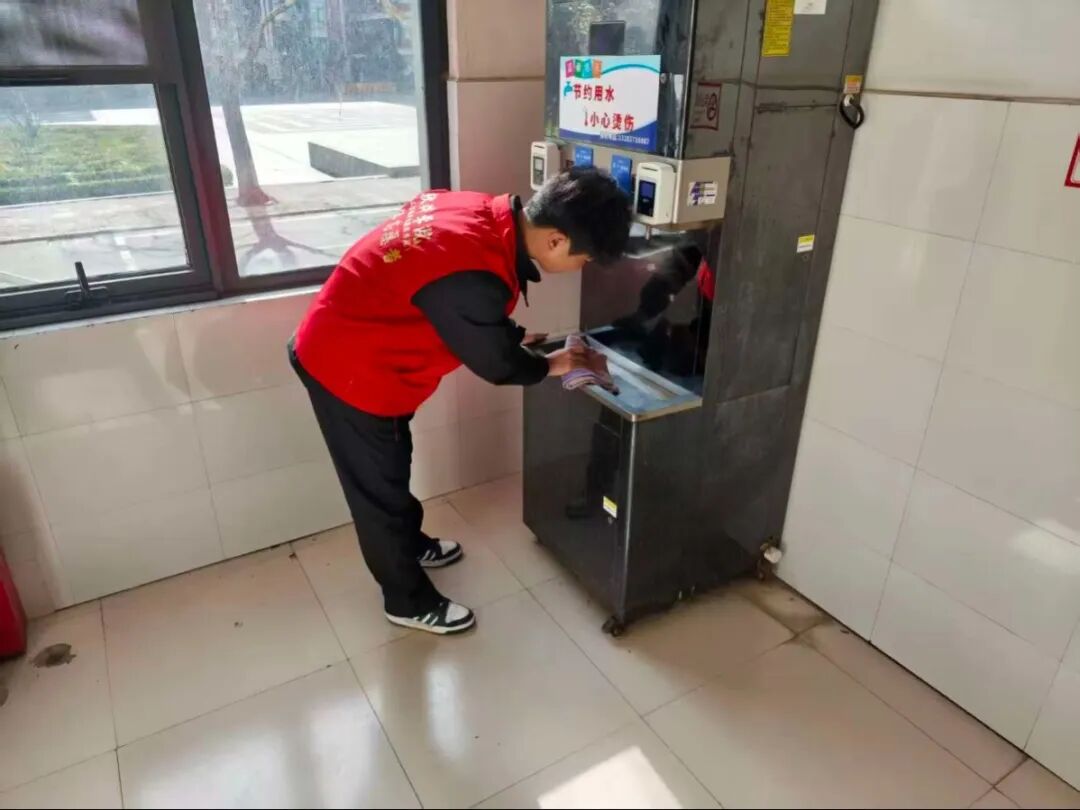 行动中,志愿者携带抹布,逐一对每台饮水机进行清洁。他们先仔细擦拭机身外壳,去除灰尘、手印和顽固污渍;重点清理接水台的水渍、水垢,用消毒剂擦拭按钮及出水口周边,确保接触面无细菌残留;最后用干抹布擦干水分,让饮水机外观洁净光亮。
