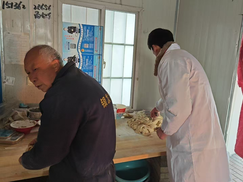 抵达周庄村后,志愿服务团在分团委书记袁挺、副书记薛芷菁以及电商直播指导蛋蛋老师的带领下正式拉开帷幕,与“辣条书记”周根灿带领的老年烙馍队开展交流。村民们详细介绍了周庄村手工馒头的发展历程:以本地优质小麦为原料,经石磨研磨保留麦香营养,无任何防腐剂添加,凭借松软筋道的口感成为当地特色农产品。志愿者们认真记录产品卖点、生产流程及包装标准,深入了解当前直播带货的运营模式、客户群体特征及销售痛点。